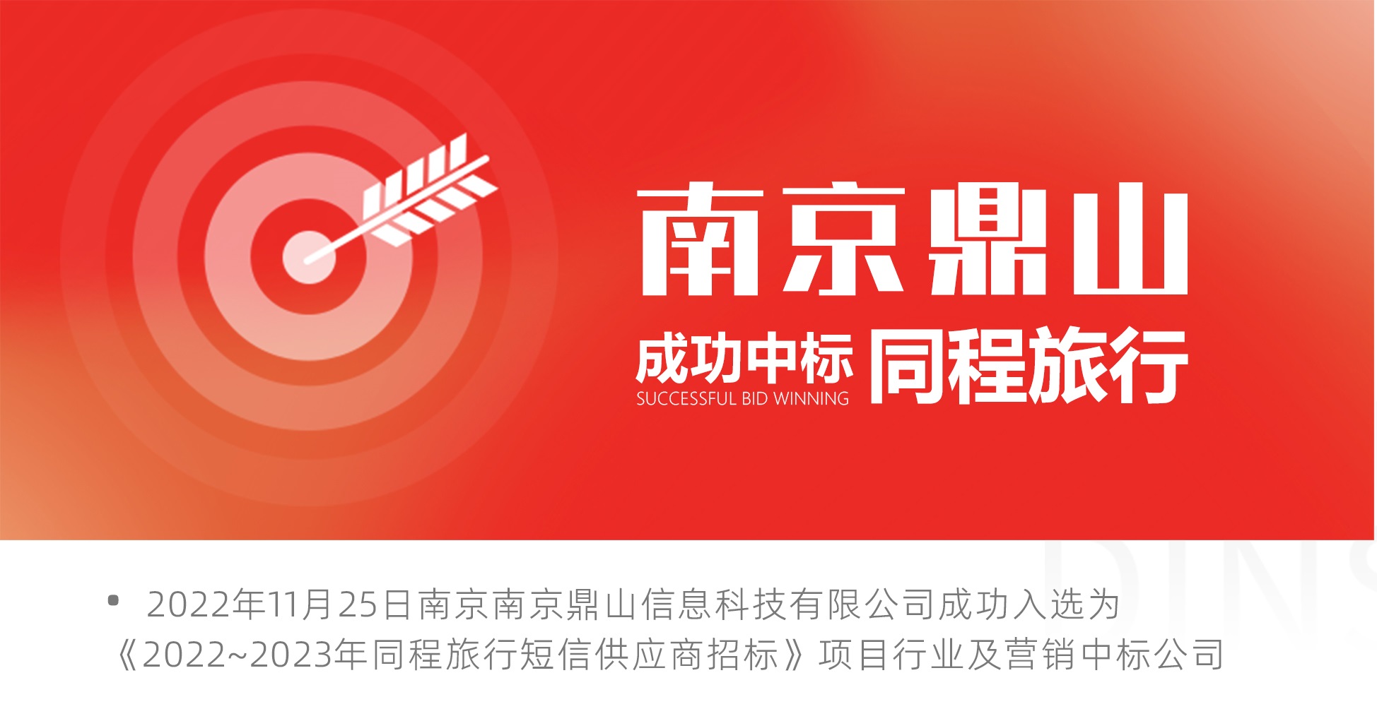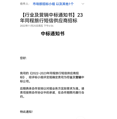 On November 25, 2022, Nanjing Dingshan Information Technology Co., Ltd. was successfully selected as the industry and marketing winning company of the project of "Bidding for Short Message Suppliers of the Same Journey from 2022 to 2023".